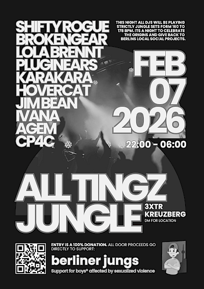 This night all DJs will be playing strictly Jungle sets from 160 to 178 BPM. It´s a night to celebrate the origins and give back to Berlins social projects.
